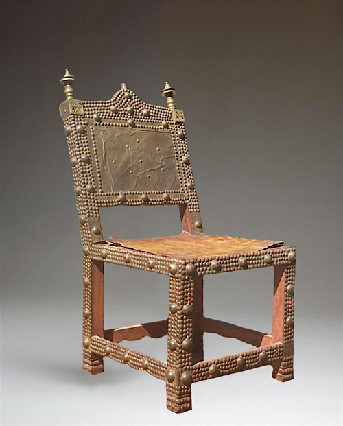 ASHANTI GHANA Bois, cuir, laiton. Ancienne chaise traditionnelle tendue de cuir et richement ornée de plaques, dont une avec des animaux au revers du dossier, et de clous de laiton.